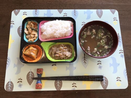 昼食 照り焼きつくね 豚肉入り五目きんぴら 二色和え 味噌汁(豆腐、おくら) きんぴらはごぼう、こんにゃくのほか肉も入っていたが、おいしかった。自分以外の人が作ったきんぴらは常にうまい。 夕食 味噌汁(作り置き) もやしハンバーグ(豚挽肉、もやし…