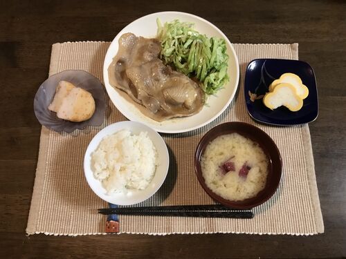 二日酔いのため胃が受け付けず、昼食は抜かす。 夕食 味噌汁(薩摩芋) 豚ロース生姜焼き(+きゃべつ) 二色玉子 小判揚げ 夜食 和風おろしハンバーグ 白菜の生姜和え 大根としいたけの煮物 付け合わせ 昼に食べなかった配達弁当を、寝酒のアテに。豪華な肴…