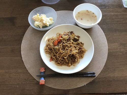 昼食 焼きそば(豚小間肉、人参、きゃべつ) ポタージュスープ(インスタント) ポテトサラダ(作り置き) 夕食 味噌汁(じゃが芋、わかめ) 麻婆豆腐 チョレギサラダ(レタス、きゅうり、ミニトマト、水菜) 煮びたし(作り置き) 今日の味噌汁は割とうまく…