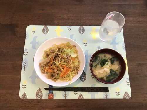 昼食 バターチキンカレー味焼きそば(豚小間肉、きゃべつ、人参) 味噌汁(ほうれん草、溶き卵) 夏限定の新しい味。焼きそばにカレー? と楽しみ半分不安半分だったが、おいしかった。ちゃんとバターチキンカレーの味がしたし、一方、ちゃんとした焼きそば…