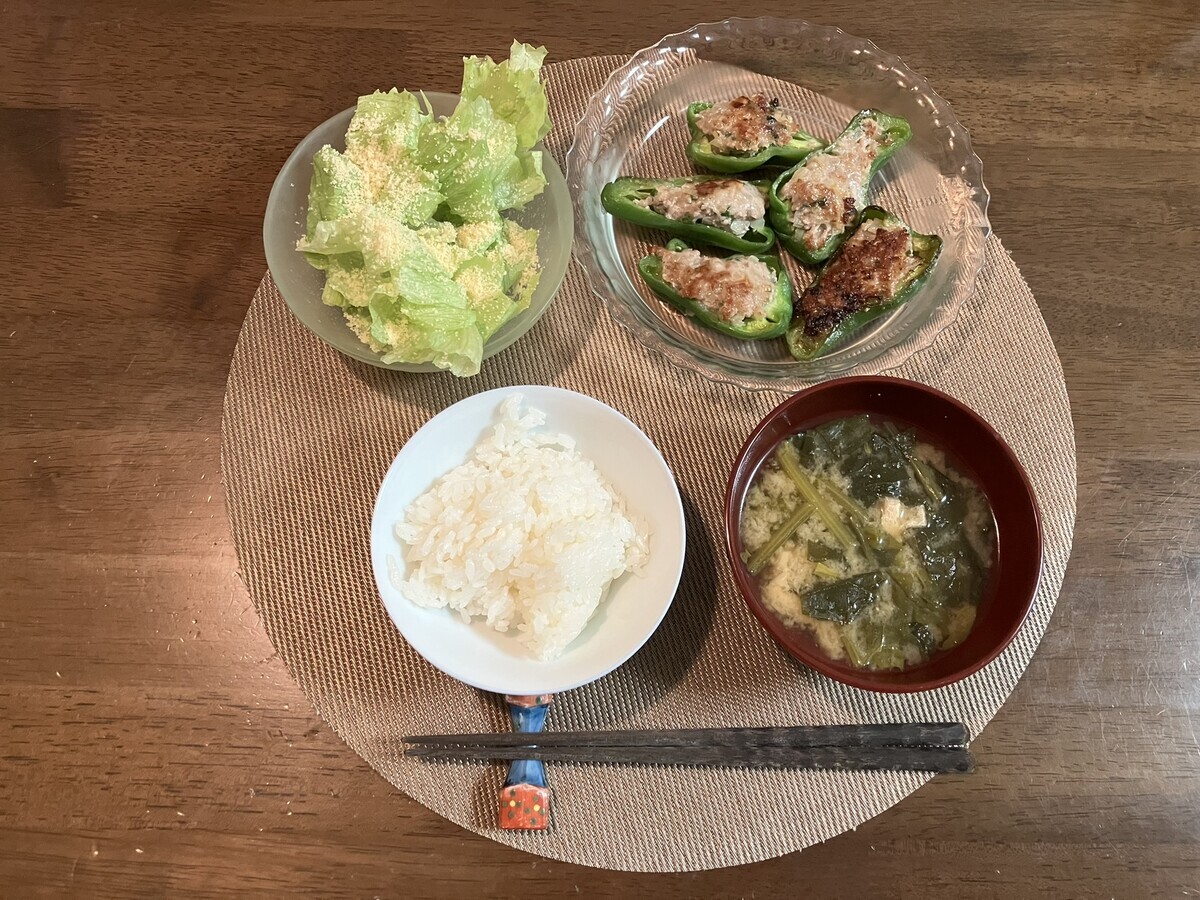 2025-11-27 ピーマンの肉詰め 夕食 味噌汁(作り置き) ピーマンの肉詰め(ピーマン、豚挽肉、玉ねぎ、大葉) サラダ(レタス、チーズ) 昼食 千里飯店(麻婆豆腐) おやつ 味の古久家(ラーメン) おうちごはんランキング